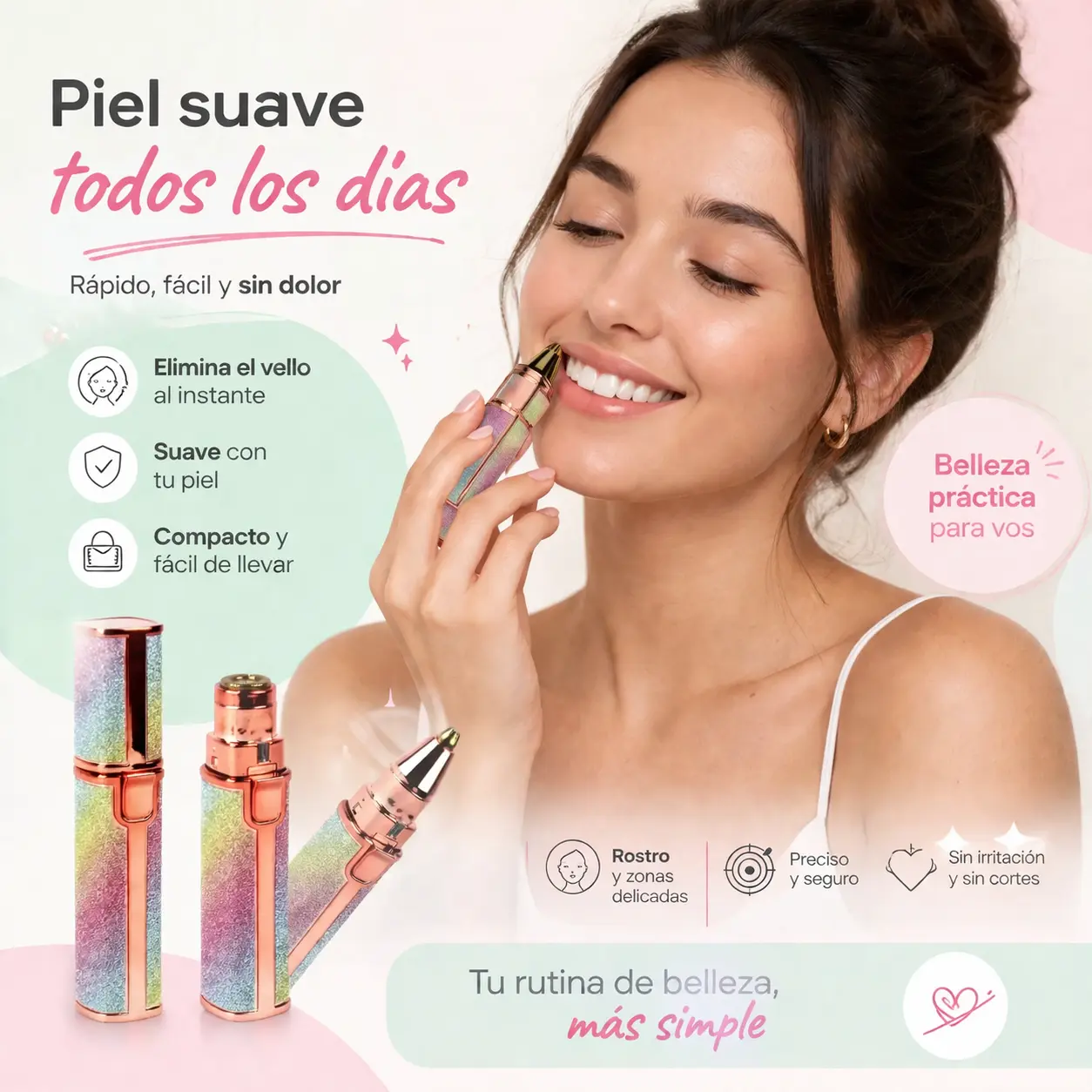 Su diseño práctico con dos cabezales intercambiables permite trabajar tanto en zonas amplias como en áreas delicadas con total precisión. Además, es portátil, higiénica y fácil de usar, ideal para mantener tu piel suave en cualquier momento y lugar.