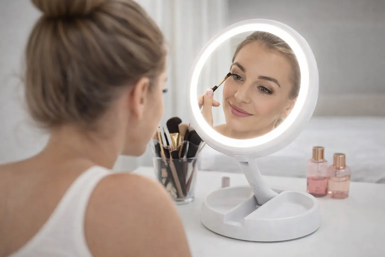 Espejo redondo con luz LED integrada, ideal para maquillaje y cuidado personal. Fabricado en vidrio de alta calidad que ofrece una imagen nítida y sin distorsión. Su diseño flexible permite ajustar el ángulo fácilmente para mayor comodidad. Incluye espejo con aumento giratorio para mayor precisión, organizador integrado para accesorios y estructura extensible de hasta 28 cm de altura. Plegable, liviano y compacto, ideal para el hogar o para llevar de viaje.