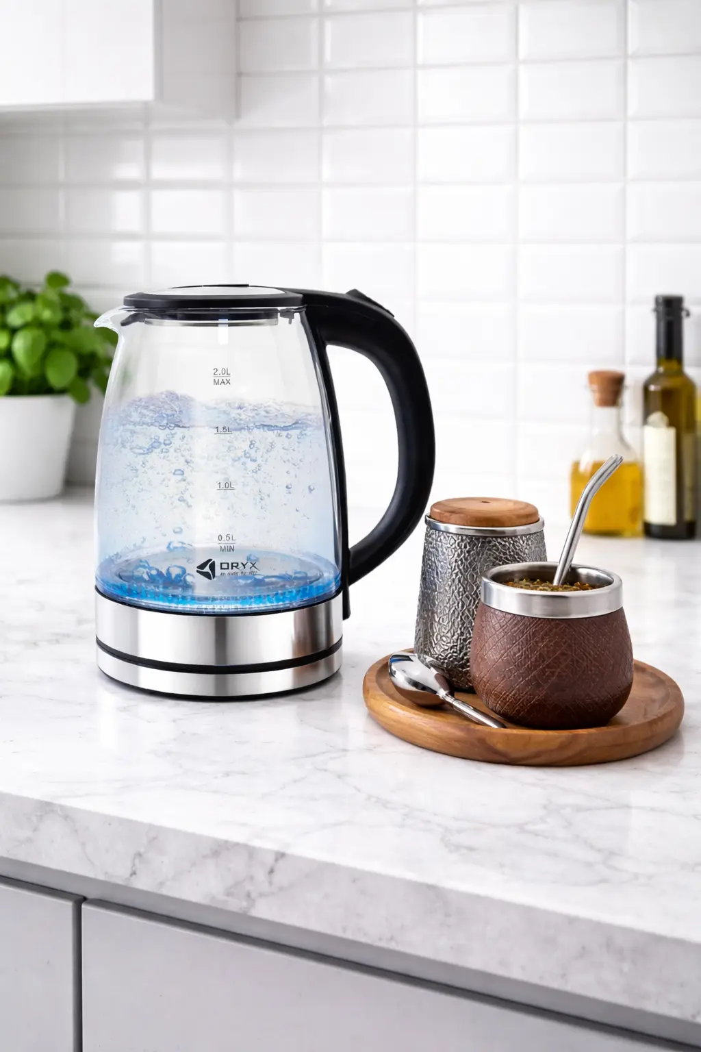 Pava eléctrica de vidrio ORYX de 2 litros con calentamiento rápido de 1500W. Cuenta con iluminación LED, base giratoria 360° y diseño moderno que permite ver el proceso de ebullición. Ideal para preparar mate, té o café de forma práctica y rápida.