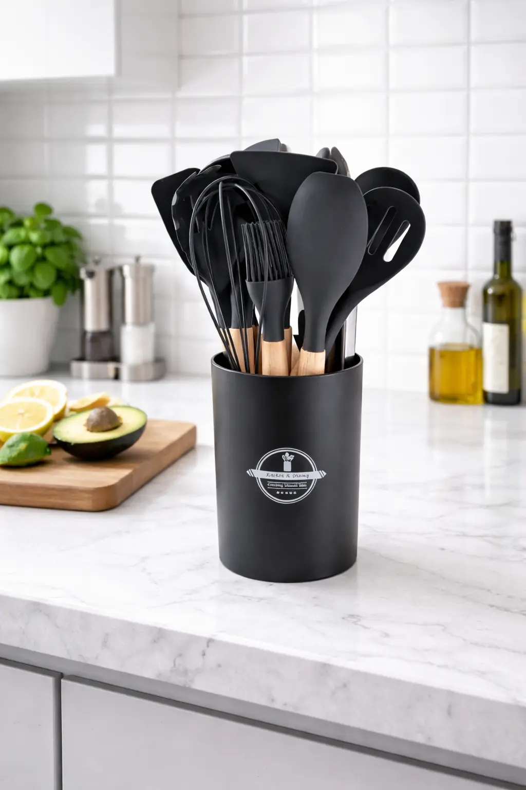 Juego de utensilios de cocina 12 UNIDADES de silicona con mangos de madera, resistentes al calor y seguros para todo tipo de ollas y sartenes. Incluye soporte organizador para mantener tu cocina ordenada. Prácticos, duraderos y fáciles de limpiar.